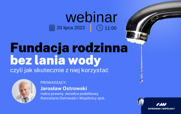 MIEJSCE: webinariumDATA: 20 lipca 2023 r.GODZINA: 11:00-12:30 Agenda: Podczas webinarium, bez ogólników i na konkretnych przykładach, radca prawny, doradca podatkowy Jarosław Ostrowski omówi realne biznesowe i życiowe powody, dla których trzeba mieć fundację rodzinną. Między innymi odpowie na pytania: • Jak ograniczyć ryzyko biznesowe dzięki fundacji?• Jak przygotować się na sprzedaż firmy, aby nie zapłacić podatku?• Jak bez podatku wypłacać zyski spółki i uniknąć „złotej klatki”?• Jak optymalnie podatkowo wynajmować nieruchomości albo inwestować na giełdzie?• Jak zabezpieczyć prywatny majątek na wypadek upadłości?• Jak finansować działalność spółek dzięki fundacji?• Jak przygotować się na korzystne wyjście z estońskiego CIT?• Jak ograniczyć ryzyko i skutki […]