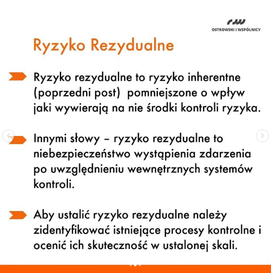 💡Innymi słowy – ryzyko rezydualne to niebezpieczeństwo wystąpienia zdarzenia po uwzględnieniu wewnętrznych systemów kontroli.